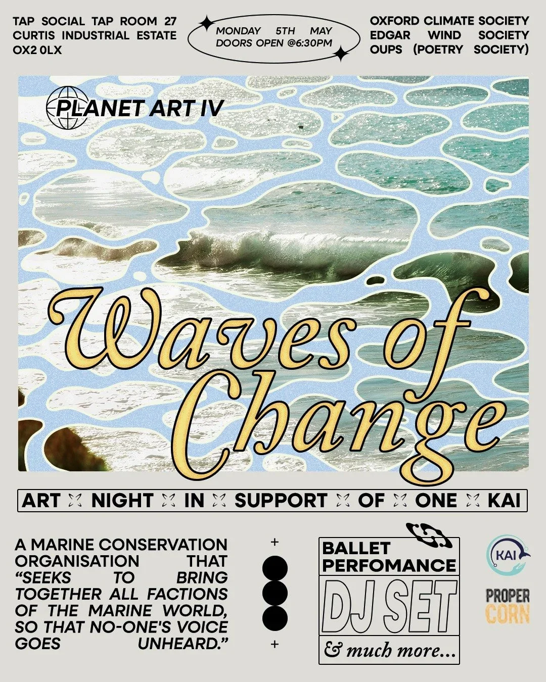 The inaugural Planet Art saw Oxford Climate Society collaborate with Edgar Wind Society for a novel night highlighting the creatives in the climate movement. Attendees were surrounded by a Ruskin School of Art eco-exhibition, enjoyed food, drinks and socialising, and live acts including poetry, film, and DJing from Soul Plaza Sounds! All proceeds went to Client Earth, an international environmental law organisation.